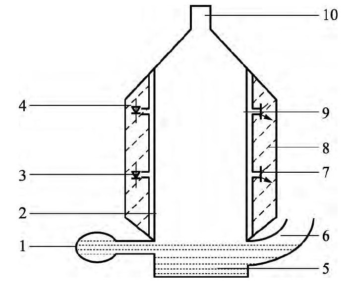 1—發泡球;2—皂膜管;3—上游狹縫;4—發光管;5—皂液;6—進氣口;7—接收管;8—金屬外殼;9—下游狹縫;10—出氣口。